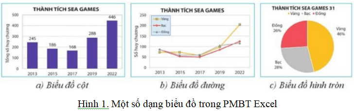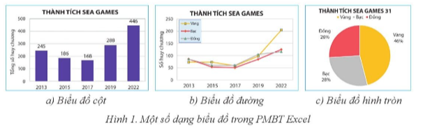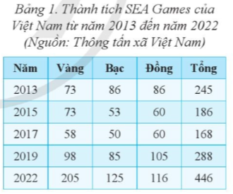Hoạt động trang 29 Tin học 8: Hãy quan sát bảng dữ liệu về thành tích SEA Games của Việt Nam trong Bảng 1 và các biểu đồ tương ứng trong Hình 1 rồi cho biết bảng dữ liệu hay các biểu đồ cho phép so sánh thành tích các năm được dễ dàng hơn.