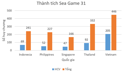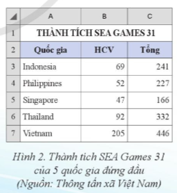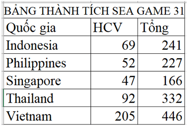 - Tạo bảng số liệu Thành tích SEA Games 31 như trong Hình 2.