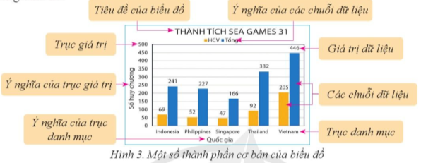 1) Trong biểu đồ có 3 chuỗi dữ liệu: vàng, bạc đồng? Ý nghĩa của mỗi chuỗi dữ liệu đó là số huy chương vàng, bạc, tương ứng đội tuyển Việt Nam đạt được qua các năm.