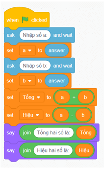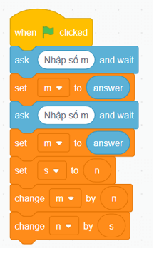Vận dụng trang 83 Tin học 8: Tạo chương trình Scratch để nhập hai số m, n từ bàn phím, thực hiện hoán đổi giá trị của hai biến và thông báo giá trị của biến m, n sau khi đã hoán đổi.