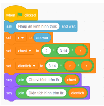 Thực hành 1 trang 82 Tin học 8: Tạo chương trình Scratch tính chu vi, diện tích hình tròn với số đo bán kính r nhập từ bàn phím. Thực hiện chương trình với các bộ dữ liệu dưới đây và ghi kết quả vào vở.