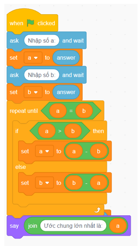 Thực hành 3 trang 94 Tin học 8: Tạo chương trình Scratch để đưa ra ước số chung lớn nhất (ƯCLN) của 2 số nguyên dương a, b được nhập từ bàn phím (xem gợi ý ở Bảng 9).