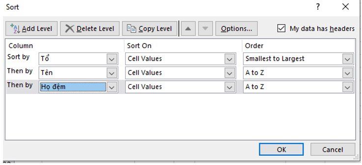 Tiêu chí sắp xếp danh sách học sinh theo thứ tự bảng chữ cái là: Sắp xếp theo tên theo thứ tự tăng dần.