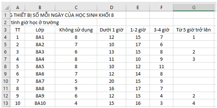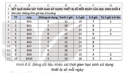 Luyện tập trang 31 Tin học 8: Để phục vụ cho việc thành lập CLB Tin học của trường, các bạn học sinh lớp 8A đã thực hiện một cuộc khảo sát trong khối 8 để tim hiểu sự ảnh hưởng của công nghệ kĩ thuật số đến cuộc sống của học sinh. Bảng dữ liệu dưới đây thống kê số học sinh của mỗi lớp đã trả lời câu hỏi “Bạn dành khoảng bao nhiêu giờ mỗi ngày sử dụng thiết bị số (điện thoại thông minh, máy tính bảng, máy tính,...) ngoài giờ học ở trường?".