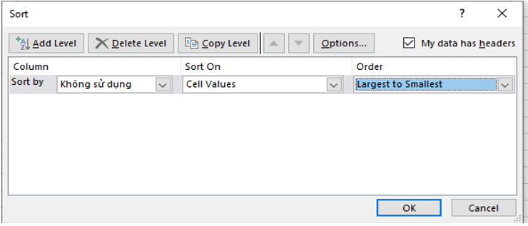 b) Sắp xếp bảng dữ liệu theo thứ tự giá trị giảm dần của cột Không sử dụng.