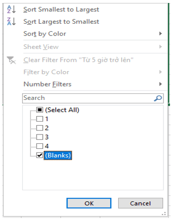 Vận dụng trang 31 Tin học 8: Ngoài các chức năng lọc mà em đã tìm hiểu trong phần thực hành, phần mềm bảng tính còn có chức năng lọc theo điều kiện. Khi nháy chuột vào nút lệnh lọc dữ liệu, em còn thấy tuỳ chọn Number Filters (hoặc Text Filters) nếu phần lớn các ô trong cột đó chứa dữ liệu số (hoặc kí tự).