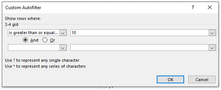 Em hãy mở tệp dữ liệu TGSDThietbiso.xlsx tìm hiểu chức năng Number Filters để lọc danh sách các lớp có số học sinh sử dụng thiết bị số từ 3 đến 4 giờ lớn hơn hoặc bằng 10 học sinh.