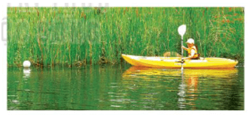Trong bức ảnh có những thành phần: mặt nước, cây cỏ, một quả bóng, một chiếc thuyền và một bạn đang chèo thuyền.
