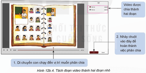 Một cứa sổ mở ra cho phép em thực hiện một số thao tác để phân chia đoạn video thành hai đoạn nhỏ. Em thực hiện theo các hướng dẫn ở Hình 12b.4