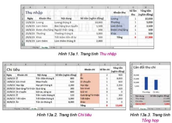 1. Em hãy chỉ ra mối liên hệ về dữ liệu của trang tính Tổng hợp ở Hình 13a.3 với hai trang tính Thu nhập và Chi tiêu ở Hình 13a.1 và Hình 13a.2.