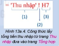 Hình 13a.4 là côn thức lấy tổng tiền thu nhập từ trang tính Thu nhập đưa vào trang Tổng hợp. Hãy ghép mỗi cụm từ Địa chỉ ô, Tên trang tính, Dấu chấm than vào vị trí tương ứng sao cho phù hợp.