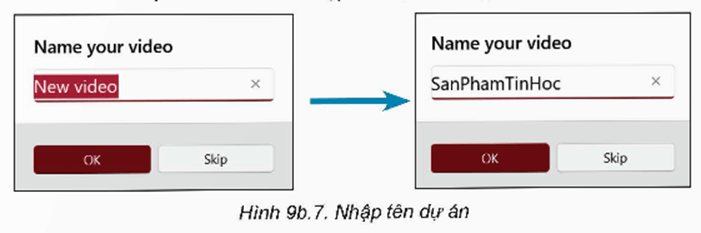 trong cửa sổ chào mừng để bắt đầu thực hiện dự án làm video. Phần mềm hiển thị cửa sổ cho em nhập tên dự án: Nhập SanPhamTinHoc rồi chọn OK.