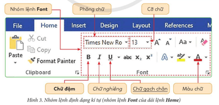 Hoạt động 1 trang 34 SGK Tin học lớp 5: Em hãy tìm hiểu nhóm lệnh định dạng kí tự dưới đây và cho biết những lệnh để chọn phông, kiểu, kích thước, màu sắc cho kí tự.