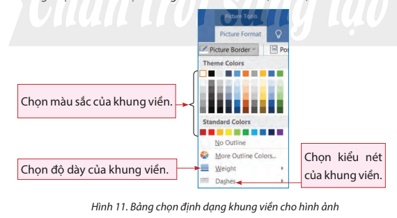 - Nháy đúp chuột vào hình ảnh để mở dải lệnh ngữ cảnh Picture Format, chọn nút lệnh Picture Border rồi chọn màu sắc, độ dày, kiểu nét vẽ trong bảng chọn mở ra để tạo khung viền cho hình ảnh (Hình 11).