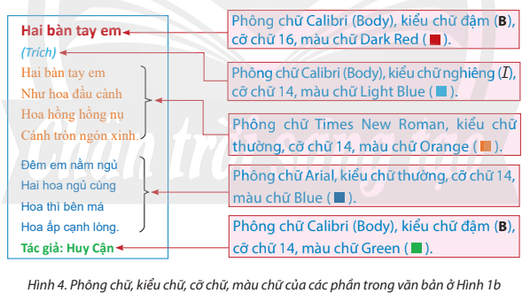 - Thông tin về phông chữ, kiểu chữ, cỡ chữ, màu chữ trong văn bản ở Hình 1b được thể hiện ở hình 4 như sau: