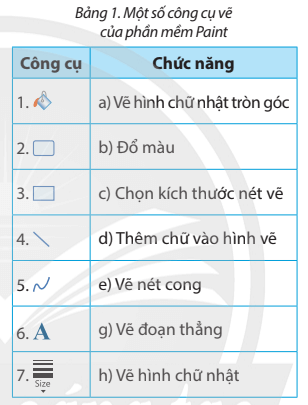 Luyện tập 3 trang 34 SGK Tin học lớp 5: Ở Bảng 1, hãy ghép công cụ ở cột bên trái với chức năng tương ứng ở cột bên phải.