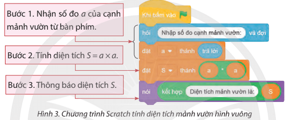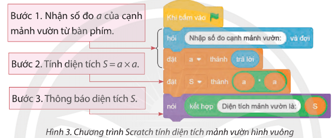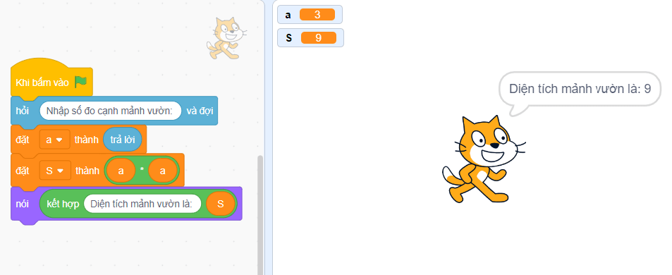 - Tạo 2 biến a và S, viết khối lệnh và chạy chương trình Scratch như ở Hình 3: