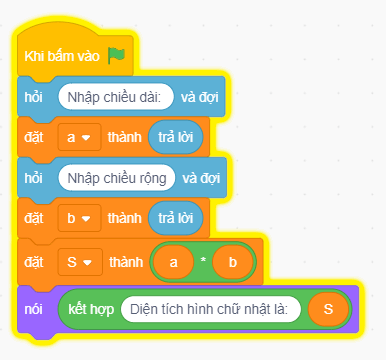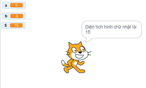 Thực hành 2 trang 41 SGK Tin học lớp 5: Tạo và chạy chương trình Scratch tính diện tích S của hình chữ nhật có số đo chiều dài a, chiều rộng b được nhập từ bàn phím.