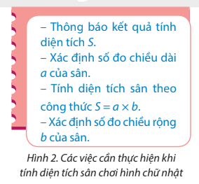 Khám phá 1 trang 38 SGK Tin học lớp 5: Sắp xếp và đánh số thứ tự các việc ở Hình 2 theo trình tự thực hiện tính diện tích sân chơi hình chữ nhật.