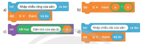 Luyện tập 1 trang 41 SGK Tin học lớp 5: Sắp xếp các lệnh, khối lệnh dưới đây để tạo chương trình Scratch tương ứng với mô tả cấu trúc tuần tự việc tính diện tích sân chơi hình chữ nhật em đã thực hiện tại của mục 1 ở phần Khám phá.