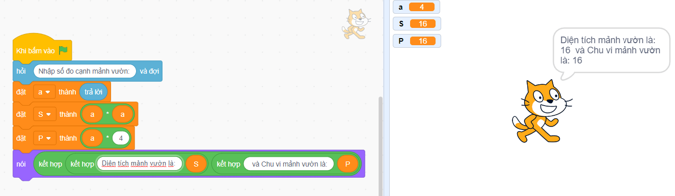 - Thực hiện phép kết hợp để ghép cụm từ “Diện tích mảnh vườn là: ” với giá trị biến