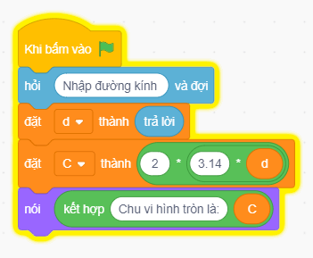 Thực hành 3 trang 41 SGK Tin học lớp 5: Tạo và chạy chương trình Scratch tính chu vi C của hình tròn có số đo đường kính d được nhập từ bàn phím.
