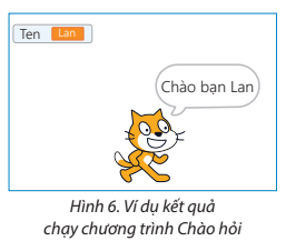 Vận dụng trang 41 SGK Tin học lớp 5: Hãy tạo chương trình Chào hỏi cho phép nhập tên người dùng từ bàn phím, sau đó nhân vật mèo trong Scratch sẽ nói "Chào bạn" kèm theo tên người dùng vừa nhập. Ví dụ, khi chạy chương trình, nhập tên người dùng là “Lan”, nhân vật mèo sẽ nói “Chào bạn Lan” (Hình 6).