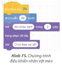 Luyện tập trang 55 SGK Tin học lớp 5: Cho chương trình điều khiển nhân vật mèo như Hình 75.