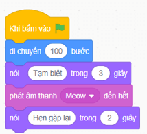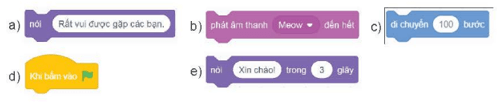 Hoạt động trang 52 SGK Tin học lớp 5: Em hãy sắp xếp các lệnh sau theo thứ tự đúng để được chương trình thực hiện ý tưởng: Nhân vật mèo xuất hiện trên sân khấu, di chuyển 100 bước và nói “Xin chào!” trong 3 giây. Mèo kêu meo và nói tiếp “Rất vui được gặp các bạn.”.