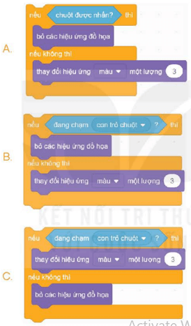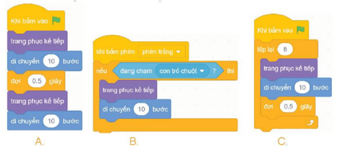 Luyện tập trang 66 SGK Tin học lớp 5: Khối lệnh nào sau đây điều khiển nhân vật hành động theo mô tả trong Hoạt động 2?