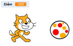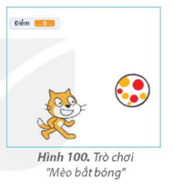 Hoạt động trang 78 SGK Tin học lớp 5: Nhóm bạn An, Minh và Khoa muốn tạo chương trình trò chơi “Mèo bắt bóng” (Hình 100), trong đó có một con mèo và một trái bóng. Bóng liên tục di chuyển trong sân khấu. Mèo di chuyển theo con trỏ chuột, con trỏ chuột di chuyển đến đâu mèo di chuyển theo đến đó. Người chơi dùng chuột để điều khiển mèo di chuyển sao cho mèo chạm được vào bóng. Mỗi lần mèo chạm vào bóng thì điểm số của người chơi được tăng thêm 1.