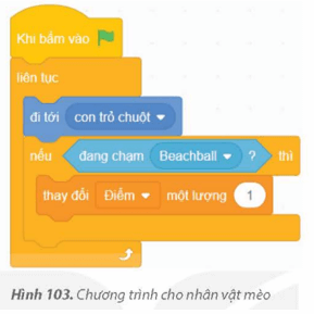 Em có thể tạo chương trình thực hiện kịch bản “Mèo bắt bóng”, trong đó chương trình cho nhân vật mèo ở Hình 103, theo cách sau: