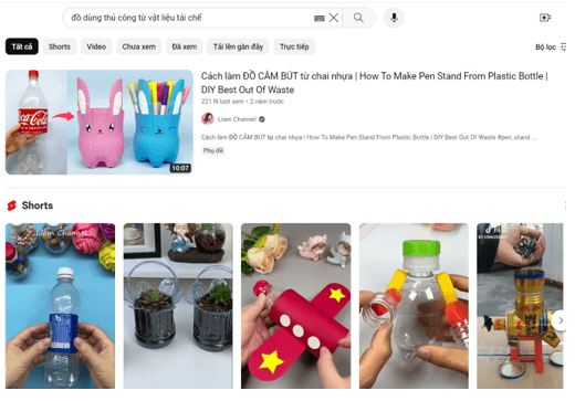 Sử dụng từ khóa “đồ dùng thủ công từ vật liệu tái chế”, em có thể tìm được các gợi ý video sau: