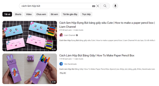 Sử dụng từ khóa “cách làm hộp bút”, em có thể tìm được các gợi ý video sau: