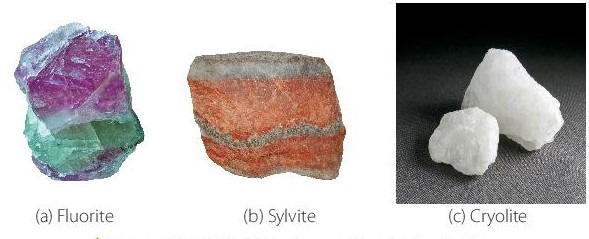 - Ion F-: Được tìm thấy trong khoáng chất như fluorite (CaF2); fluorapatite (Ca5(PO4)3F) và cryolite (Na3AlF6).