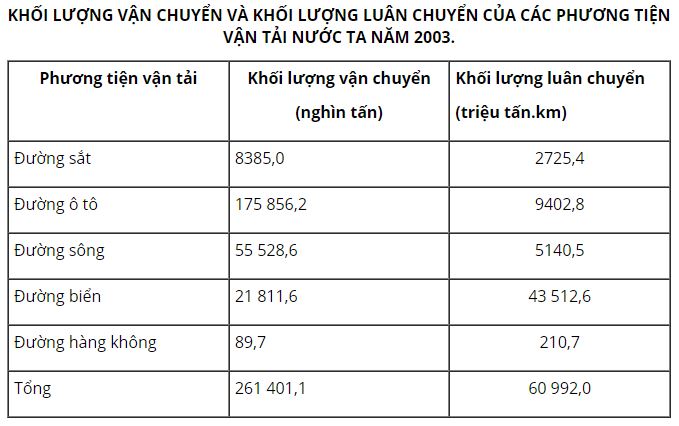 Hãy tính cự li vận chuyển trung bình về hàng hóa của một số loại phương tiện vận tải ở nước ta năm 2003 theo bảng số liệu sau: