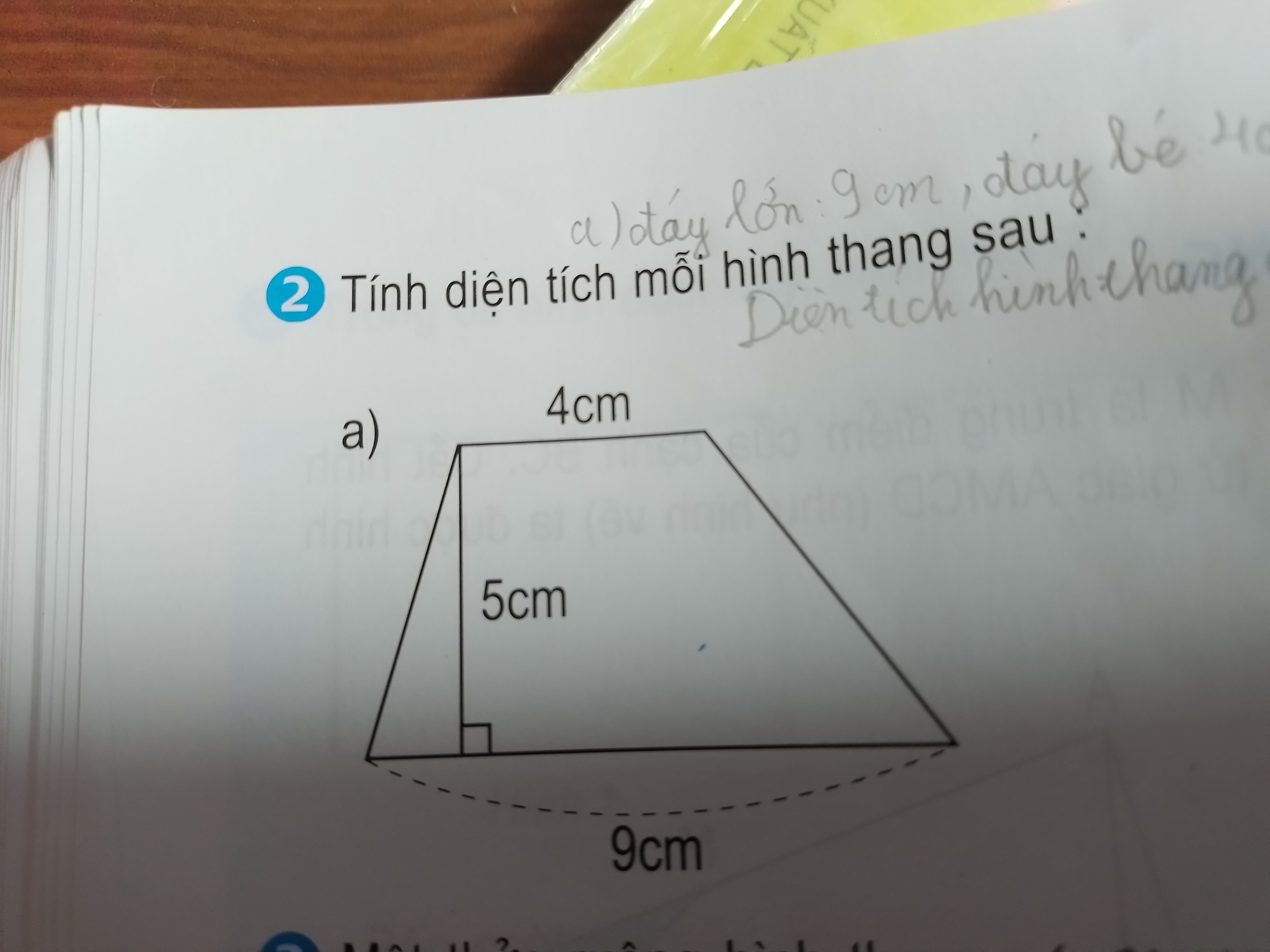 Tính diện tích hình thang có đáy lớn b = 9cm, đáy bé a = 4cm, chiều cao h = 5cm