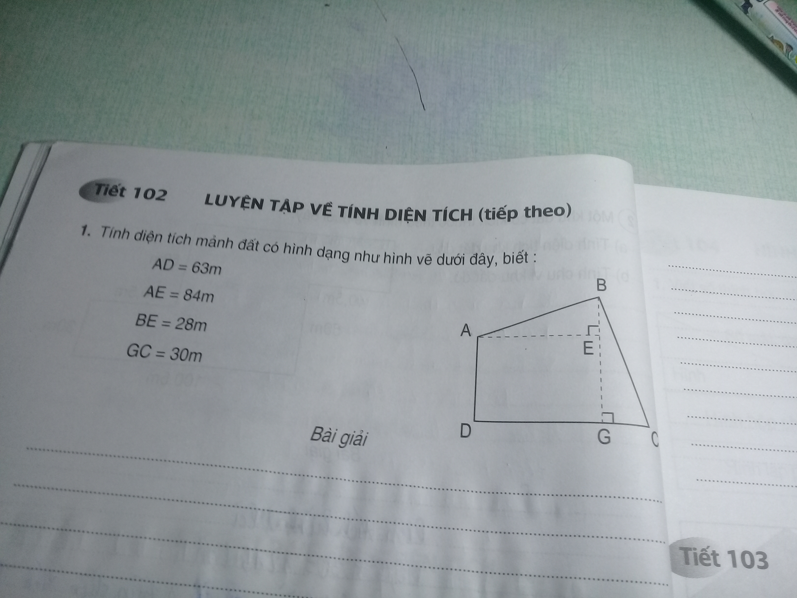 Tính diện tích mảnh đất có hình dạng hình vẽ dưới đây biết AD = 63m, AE = 84m, BE = 28m, GC = 30 m