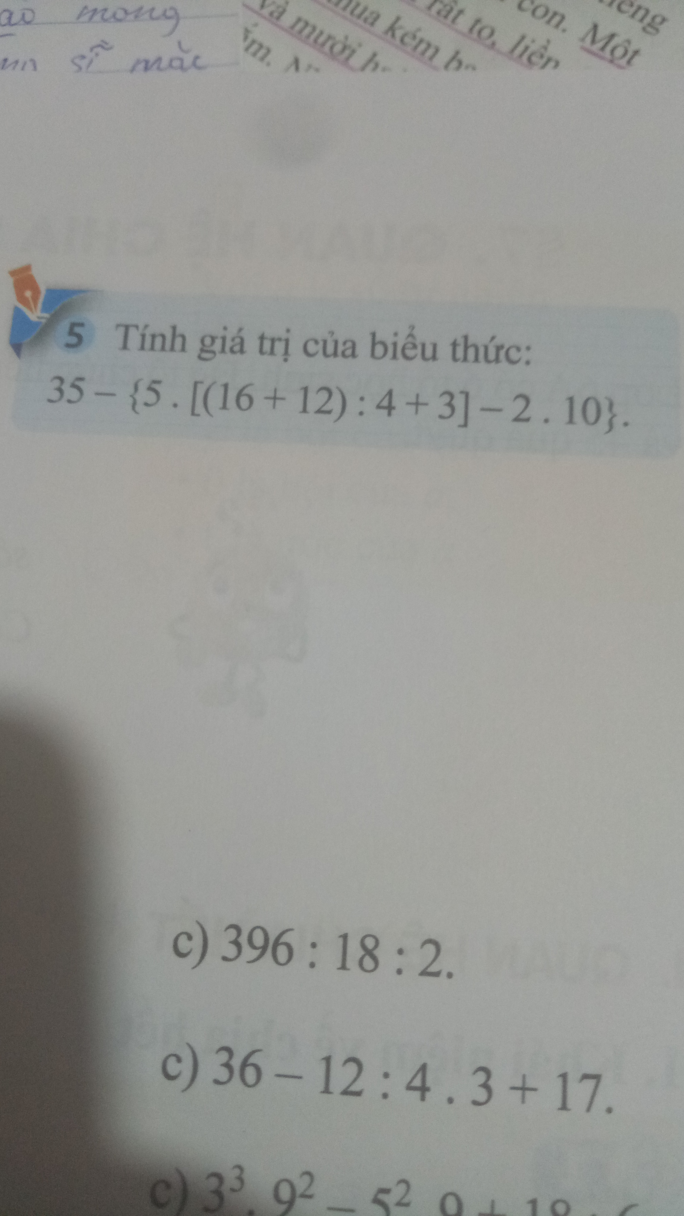 Tính giá trị của biểu thức 35 – {5 .[(16 + 12) : 4 + 3] – 2 . 10}