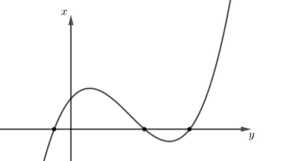 bx^{2} + cx + d\) cắt trục hoành tại ba điểm phân biệt nên hàm số có 2 điểm cực trị giả sử đồ thị của hàm số đó như sau: