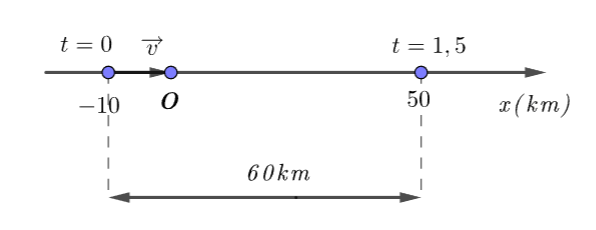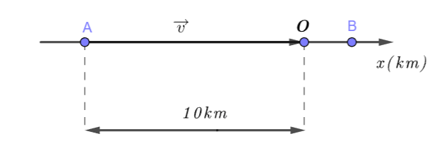 Ví dụ 2: Lúc 7 giờ một ô tô khởi hành với tốc độ 60km/h từ điểm A tới điểm B. Coi chuyển động của ô tô là thẳng đều. Nếu chọn trục toạ độ Ox trùng với đường chuyển động của ô tô, chiều dương hướng từ A đến B, gốc toạ độ O nằm giữa A và B và cách A 10km, gốc thời gian là lúc 8 giờ thì phương trình chuyển động của ô tô là: