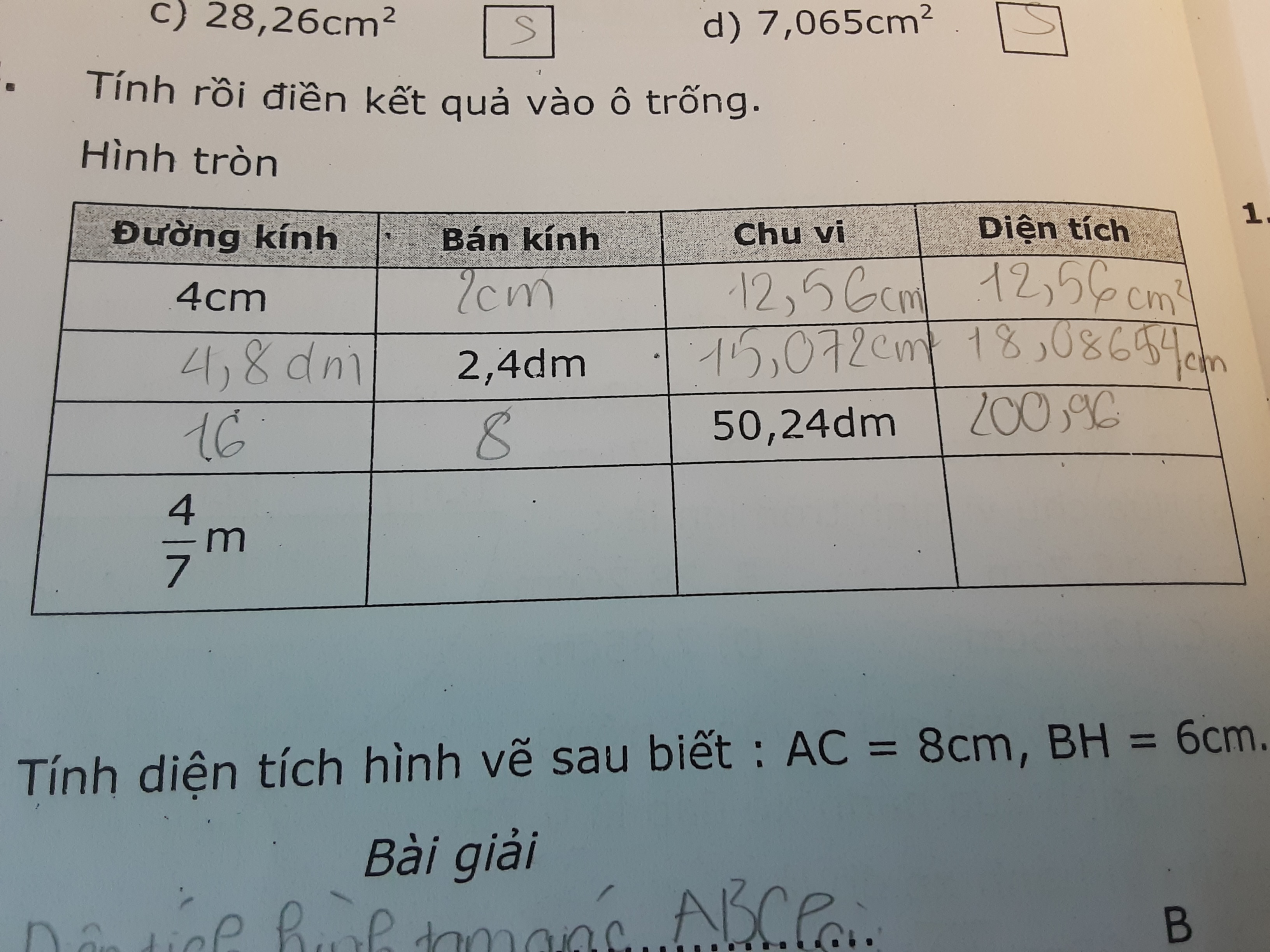 Tính rồi điền kết quả vào ô trống: Cho đường kính 4cm, tính bán kính, chu vi và diện tích