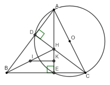 Bài 5: Cho tam giác ABC có ba góc nhọn. Vẽ đường tròn tâm O đường kính BC lần lượt cắt AB, AC tại D và E. BE cắt CD tại H. Biết số đo cung DE bằng 600
