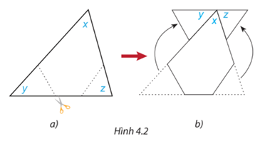 Cắt một hình tam giác bằng giấy bất kì (H.4.2a). Đánh dấu ba góc là x, y, z. Cắt hai góc y, z và ghép lên góc x như Hình