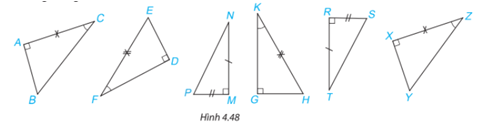 Trong Hình 4.48, hãy tìm các cặp tam giác vuông bằng nhau và giải thích vì sao chúng bằng nhau.