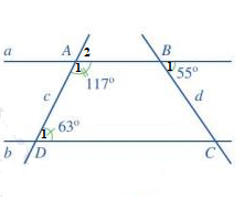 \(117^\circ + \widehat {{A_2}} = 180^\circ \Rightarrow \widehat {{A_2}} = 180^\circ - 117^\circ = 63^\circ\)