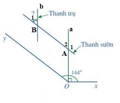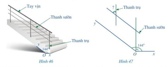 \(144^\circ\). Hỏi góc nhọn tạo bởi một thanh sườn với một thanh trụ của lan can là bao nhiêu độ?