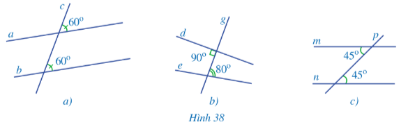 - Trong hình 38b ta quan sát thấy có hai góc so le trong không bằng nhau (90° ≠ 80°) nên ta dự đoán đường thẳng d không song song với đường thẳng e. Hình 38b không có đường thẳng song song.