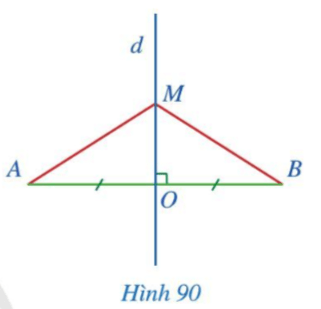 Cho đoạn thẳng AB có trung điểm O, d là đường trung trực của đoạn thẳng AB, điểm M thuộc d, M khác O (Hình 90).