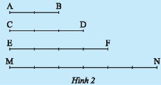 So sánh tỉ số của hai đoạn thẳng AB và CD với tỉ số của hai đoạn thẳng EF và MN trong Hình 2.